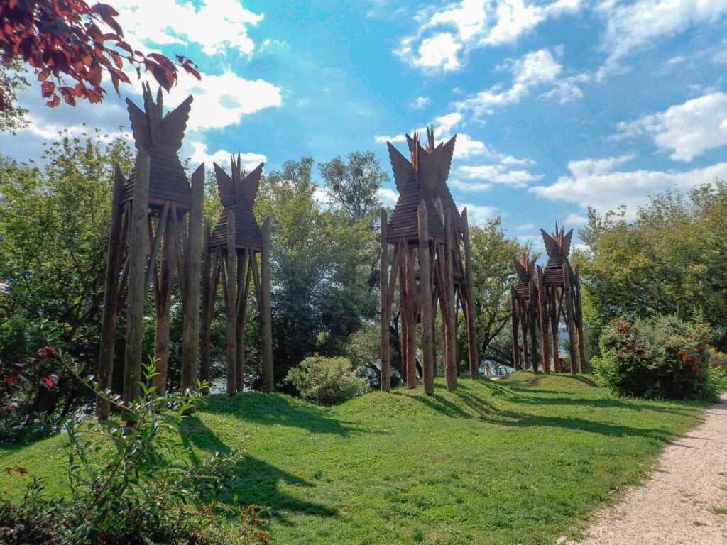 Festménybe illő háttérrel hét muzsikáló haranglábat csodálhatunk meg Verőce szélén.